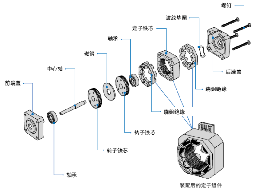 下图为混合式步进电机的组成结构:最重要的包括端盖、中心轴、轴承、定转子铁芯、绕组绝缘部件等。